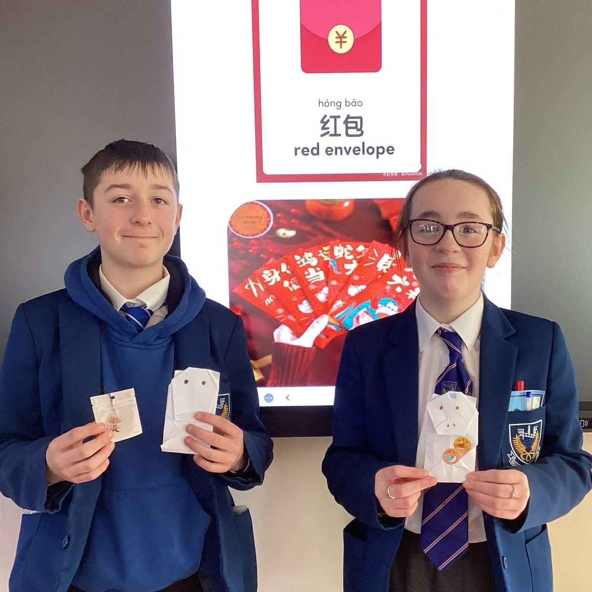 Today in Culture Club, we made red envelopes—traditional gifts given to children during Chinese New Year, usually filled with money. Mr. Guan gave Alan and Abby Labubu pendants and chocolate to place in their envelopes. Happy Chinese New Year!